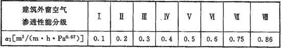 式中:α1——外門窗縫隙滲風(fēng)系數(shù)[m3/(m·h·pab)],當(dāng)無實(shí)測數(shù)據(jù)時(shí),可根據(jù)建筑外窗空氣滲透性能分級(jí)的相關(guān)標(biāo)準(zhǔn),按表F.0.3采用;