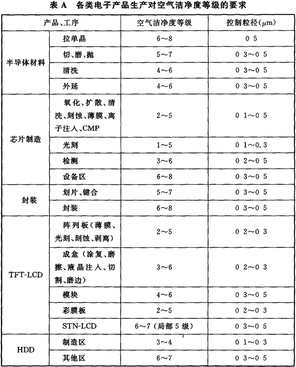附錄A 各類(lèi)電子產(chǎn)品生產(chǎn)對(duì)空氣潔凈度等級(jí)的要求
