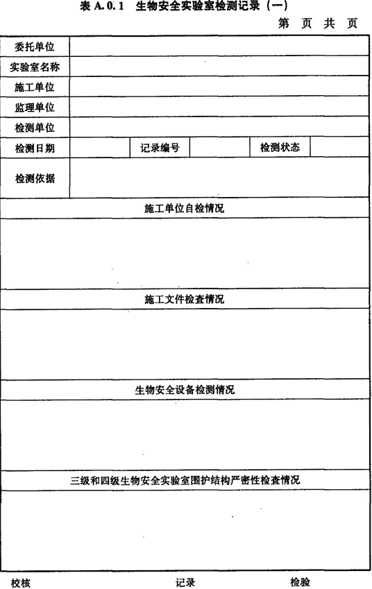 A.0.1 生物安全實驗室施工方自檢情況、施工文件檢查情況、生物安全柜檢測情況、圍護(hù)結(jié)構(gòu)嚴(yán)密性檢測情況應(yīng)按表A.0.1進(jìn)行記錄。