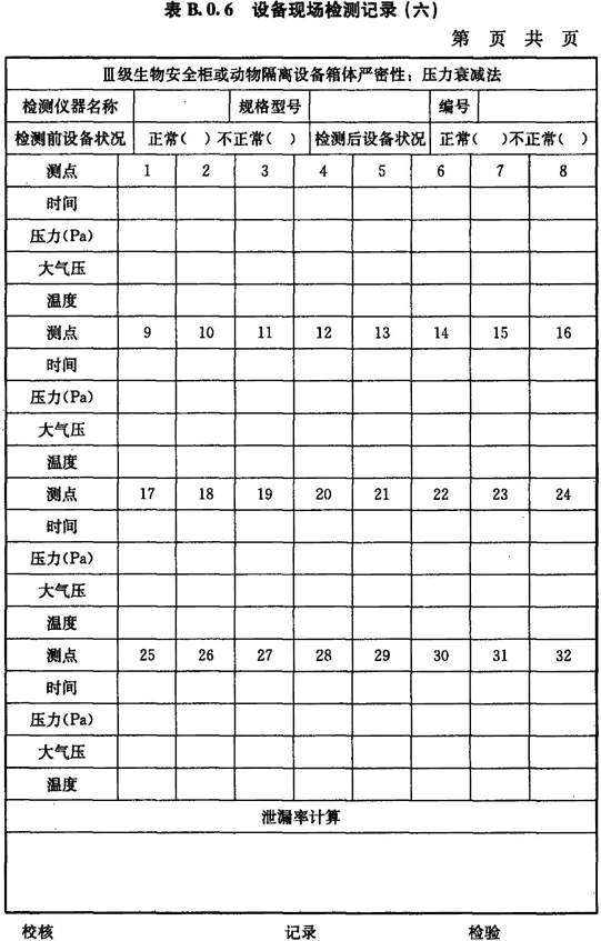 B.0.6 Ⅲ級生物安全柜或動物隔離設備箱體密封性的檢測應按表B.0.6進行記錄。