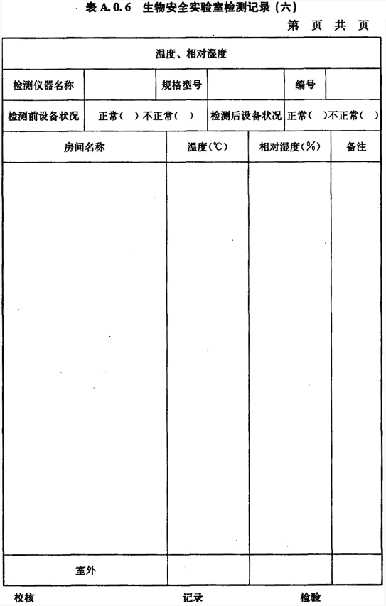 A.0.6 生物安全實驗室房間溫度、相對濕度的檢測應(yīng)按表A.0.6進(jìn)行記錄。