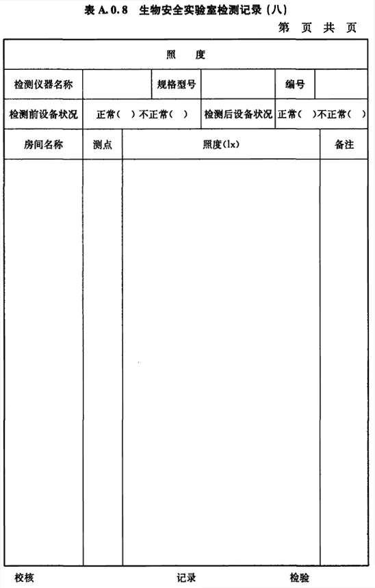 A.0.8 生物安全實驗室房間照度的檢測應(yīng)按表A.0.8進(jìn)行記錄。