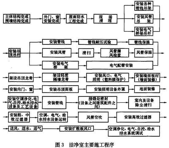 9.1.1 三級和四級生物安全實驗室是有負(fù)壓要求的潔凈室,除了在結(jié)構(gòu)上要比一般潔凈室更堅固、更嚴(yán)密外,在施工方面,其他要求與空調(diào)凈化工程是基本一致的,為達(dá)到安全防護(hù)的要求,施工時一定要嚴(yán)格按照潔凈室施工程序進(jìn)行,潔凈室主要施工程序參考圖3。
