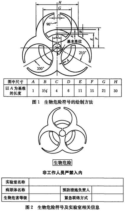 4.2.8 二級、三級、四級生物安全實驗室的操作對象都不同程度地對人員和環(huán)境有危害性,因此根據(jù)國際相關(guān)標準,生物安全實驗室入口處必須明確標示出國際通用生物危險符號。生物危險符號可參照圖1繪制。在生物危險符號的下方應(yīng)同時標明實驗室名稱、預防措施負責人、緊急聯(lián)絡(luò)方式等有關(guān)信息,可參照圖2。