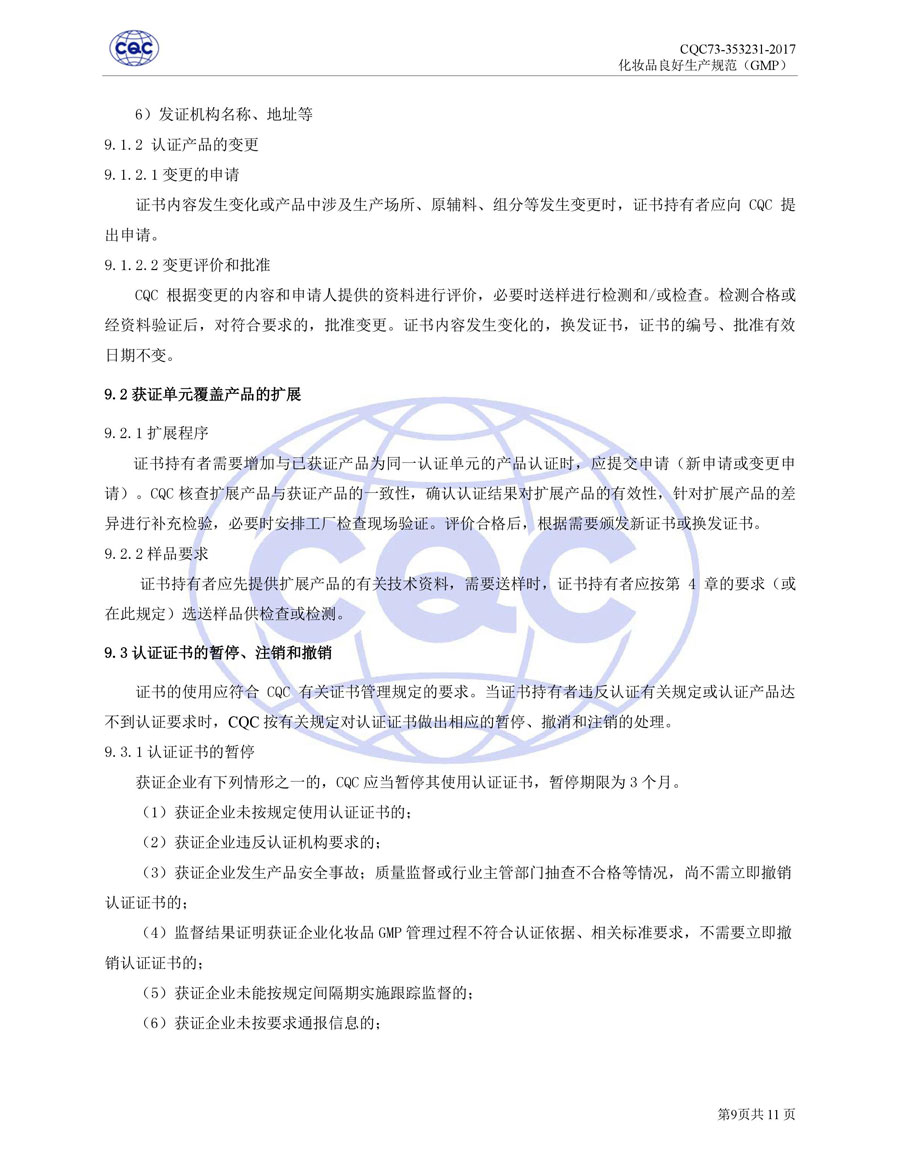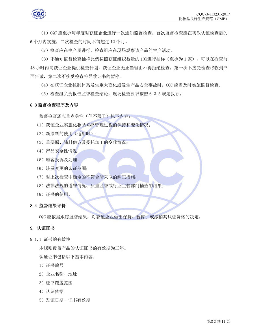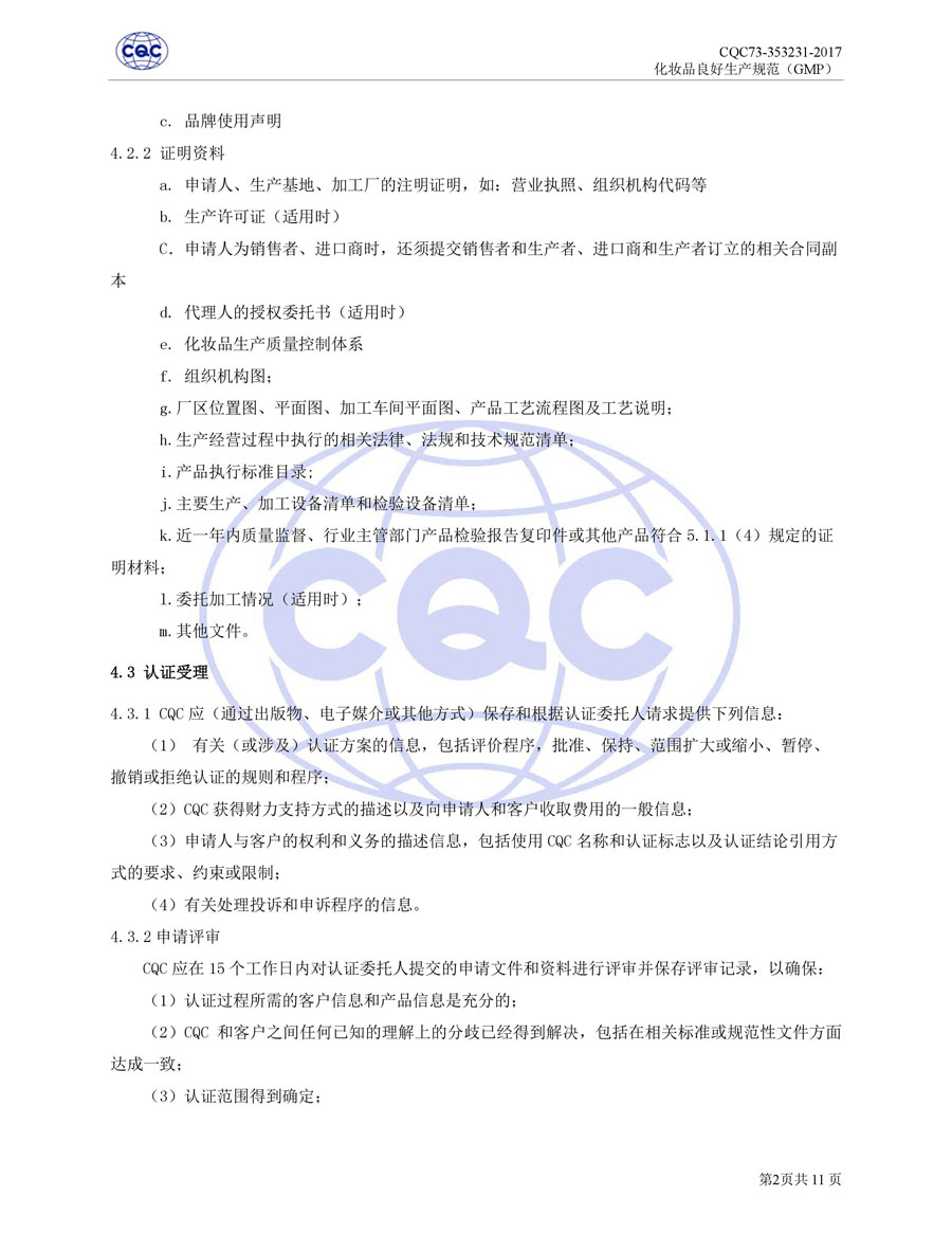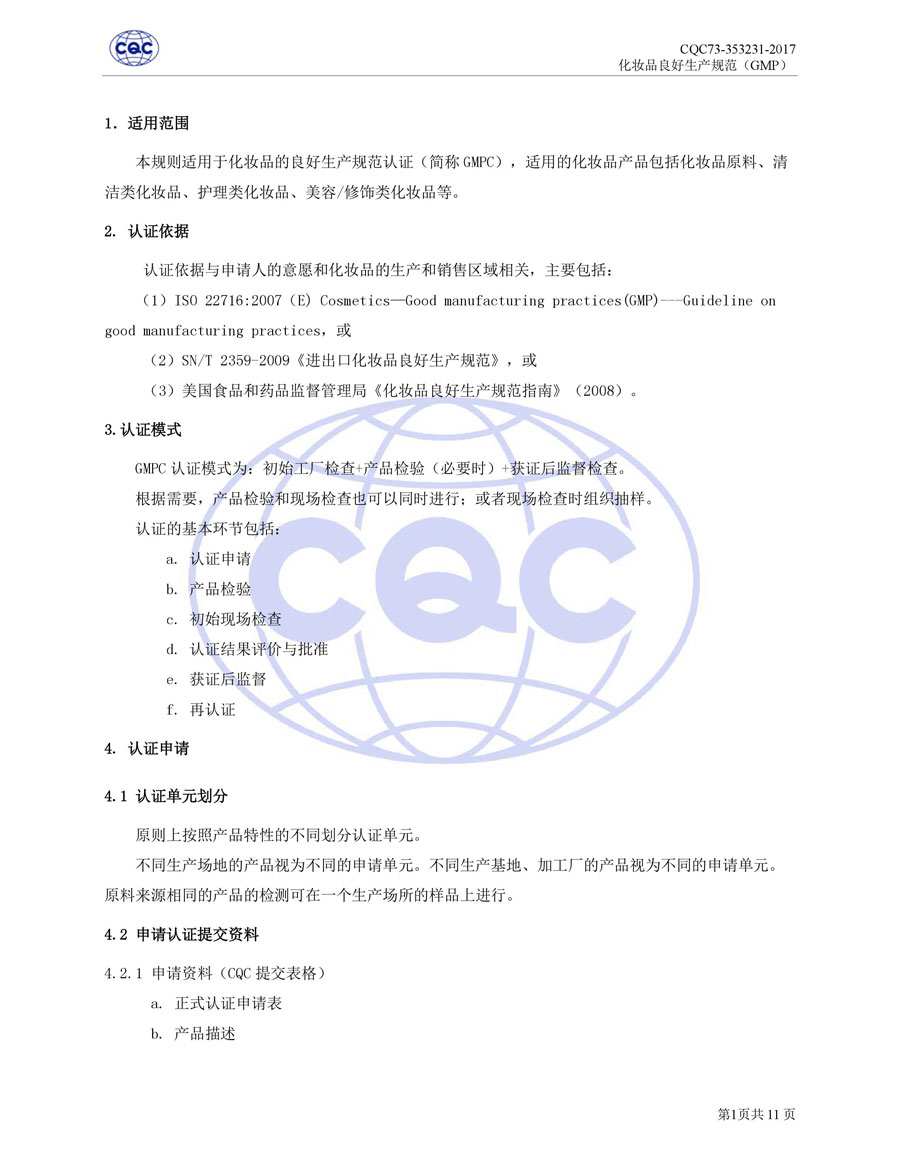 認(rèn)證依據(jù)為美國農(nóng)業(yè)部《Cosmetic Good Manufacturing Practice Guideline》, European Federation for Cosmetic Ingredients (EFfIC)-GMP for cosmetic ingredient,ISO 22716-2007《化妝品良好生產(chǎn)規(guī)范》、CQC73-353231-2016《化妝品認(rèn)證實施規(guī)則》及適用的法律法規(guī)等。